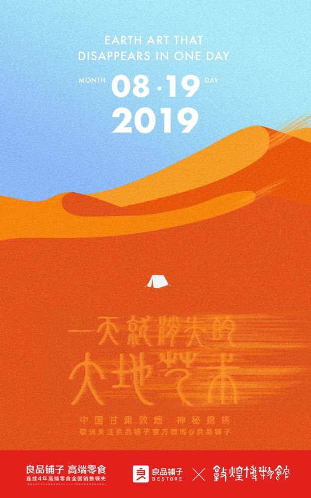 8月19日,良品鋪子還將在敦煌沙漠演繹了一場“只存在一天的大地藝術”。敦煌沙漠上會出現(xiàn)一幅精美的大地沙畫,忽然風沙起,美好的景象頃刻間流逝。年輕的藝術家們近一周的創(chuàng)作,用“沙畫”的形式再現(xiàn)經(jīng)典敦煌壁畫,希望通過再現(xiàn)沙畫風化消逝的過程呼吁更多關注和保護敦煌文化。