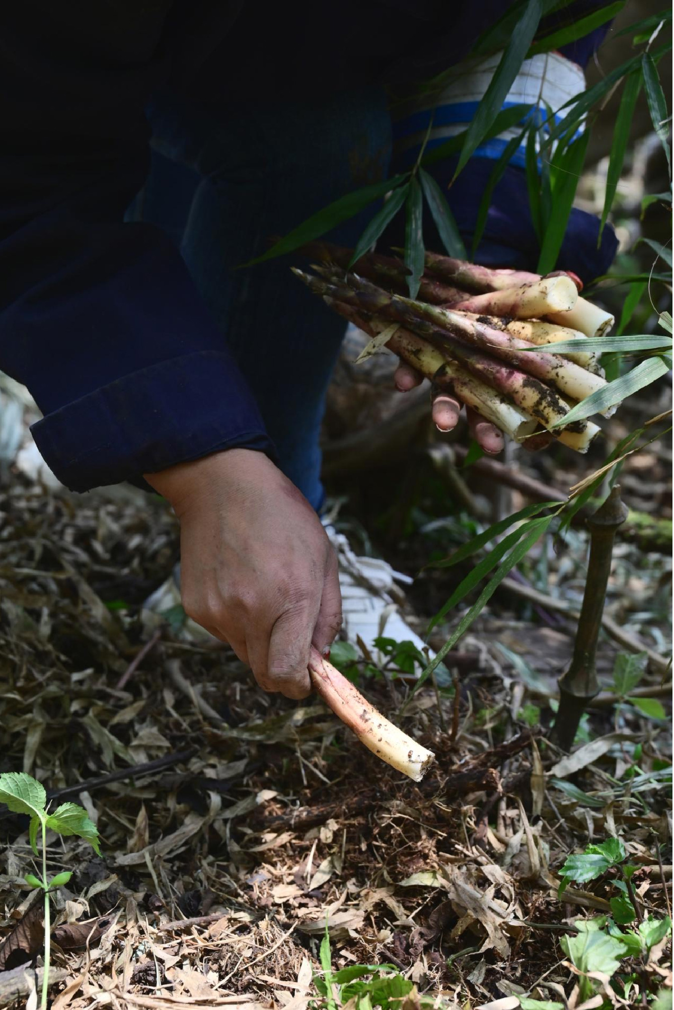 清晨四五點,徐井貴和朱新燕背著背簍,騎著摩托車就上了山。天然竹林里,滾石、苔蘚、雜木叢生,巖壁陡峭,土壤松軟濕滑,一不小心,就容易滑落。“保護好這些野生竹,不能亂砍,得小心翼翼地采。”徐井貴說,采筇竹筍時,還不用刀砍,更不能鏟挖。只見他俯下身子,手貼近地面,捏住竹節(jié)處,輕輕用力一扳,隨著“啵”的一聲,鮮嫩的筇竹筍便被扳下來了。一位位筍農每天都要經歷上千次的彎腰尋筍,數百次的徒手采摘。每一根鮮筍都是他們徒步12小時純人力扛下山。半路口渴了,就找個泉眼坐下,汲幾口水。在筍農搭建的棚戶下,人們圍坐一起,麻利地脫去筍衣,通過肩背、摩托車等方式小批量轉運至集散地,售賣給收筍經紀人。